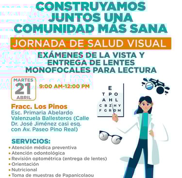 Hermosillo .- Este martes 21 de abril, las y los vecinos del sector del fraccionamiento Los Pinos podrán asistir a la Jornada de Salud Visual que realiza Gobierno de Hermosillo a través de la Dirección de Salud Municipal, informó Luis Becerra Hurtado.